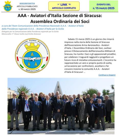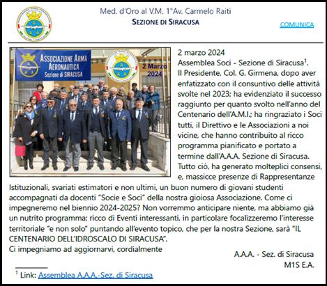 Associazione Arma Aeronautica Aviatori d’Italia Sezione di Siracusa ————— Il Presidente Giovanni Girmena |
